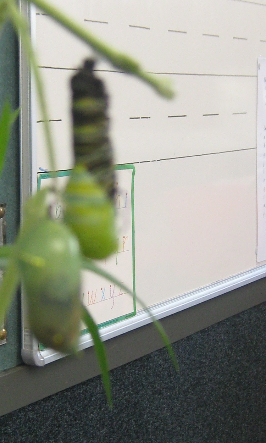 We arrived at school to find that our first chrysalis had hatched into a beautiful monarch butterfly!